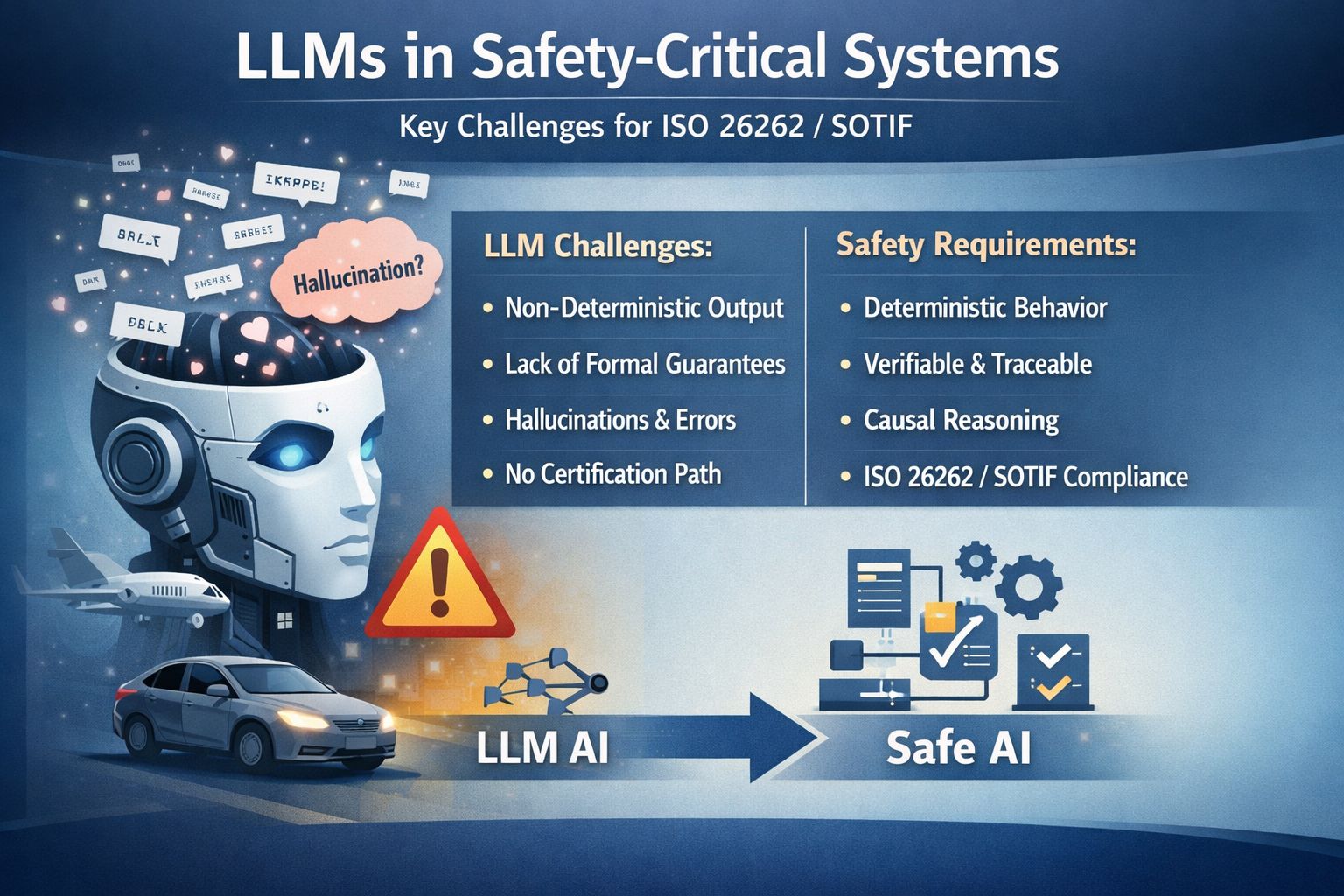 Explicit assumptions, traceable decisions, and certification-aware system design under ISO 26262 and SOTIF constraints.
